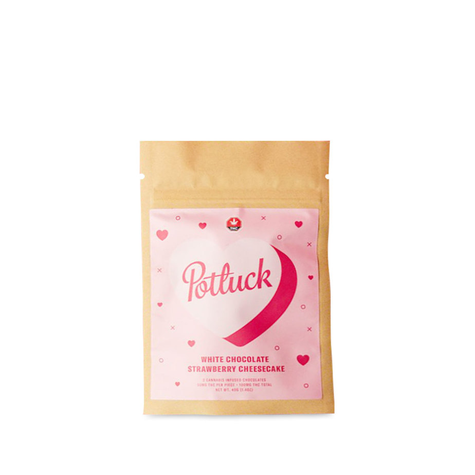 Set the mood the right way this year with Potluck White Chocolate Strawberry Cheesecake Hearts! These delicious chocolates are made with rich, luscious white chocolate, real strawberries and a deep, flavourful cheesecake before being infused with a whopping 100mg THC. Potluck’s keen attention to detail and irresistible recipes will keep you coming back for more – ditch the grocery store-bought chocolates and spark some joy into your relationship with Potluck White Chocolate Cheesecake Hearts!